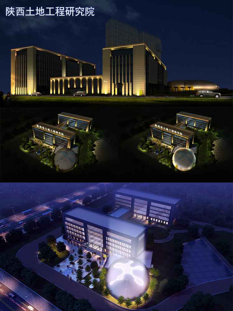 簡介—— 陜西土地工程研究院是承擔(dān)各類建設(shè)工程勘察、設(shè)計、土建、安裝、市政、石化、公路、地鐵、機場、礦山、核電、裝飾、鋼結(jié)構(gòu)、古建園林工程施工。對于設(shè)計院辦公樓體亮化設(shè)計,公司設(shè)計師跟根其前后樓體的建筑和廣場的球狀建筑的特點,采用簡單的洗墻燈和投光燈來進行效果設(shè)計,彰顯建筑的大氣與威嚴(yán)。