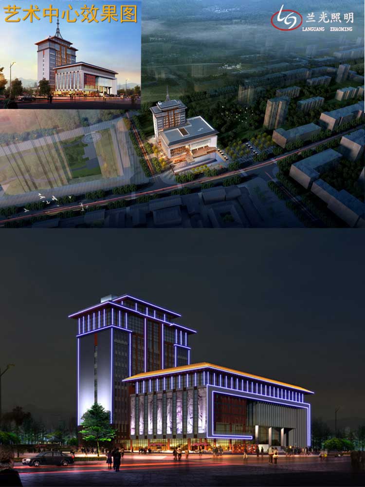 簡介—— 藝術中心辦公樓體亮化設計,辦公樓主體設計采用藍色輪廓燈與暖色投光燈,冷暖結合的設計原理,進行整體樓體亮化設計。