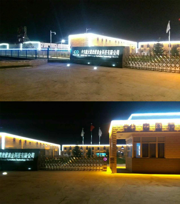 中節(jié)能大荔光伏農(nóng)業(yè)科技有限公司廠區(qū)亮化項(xiàng)目,是我們陜西蘭光照明2015年承接的亮化工程。公司設(shè)計(jì)師根據(jù)廠家要求簡單實(shí)用的特點(diǎn),整個(gè)廠區(qū)的設(shè)計(jì)全部采用線條燈和輪廓燈,將整個(gè)廠區(qū)的廠房、大門、廠區(qū)道路、辦公樓以輪廓勾勒的形式展現(xiàn)出來,照亮整個(gè)廠區(qū),達(dá)到客戶廠區(qū)樓宇亮化需求。