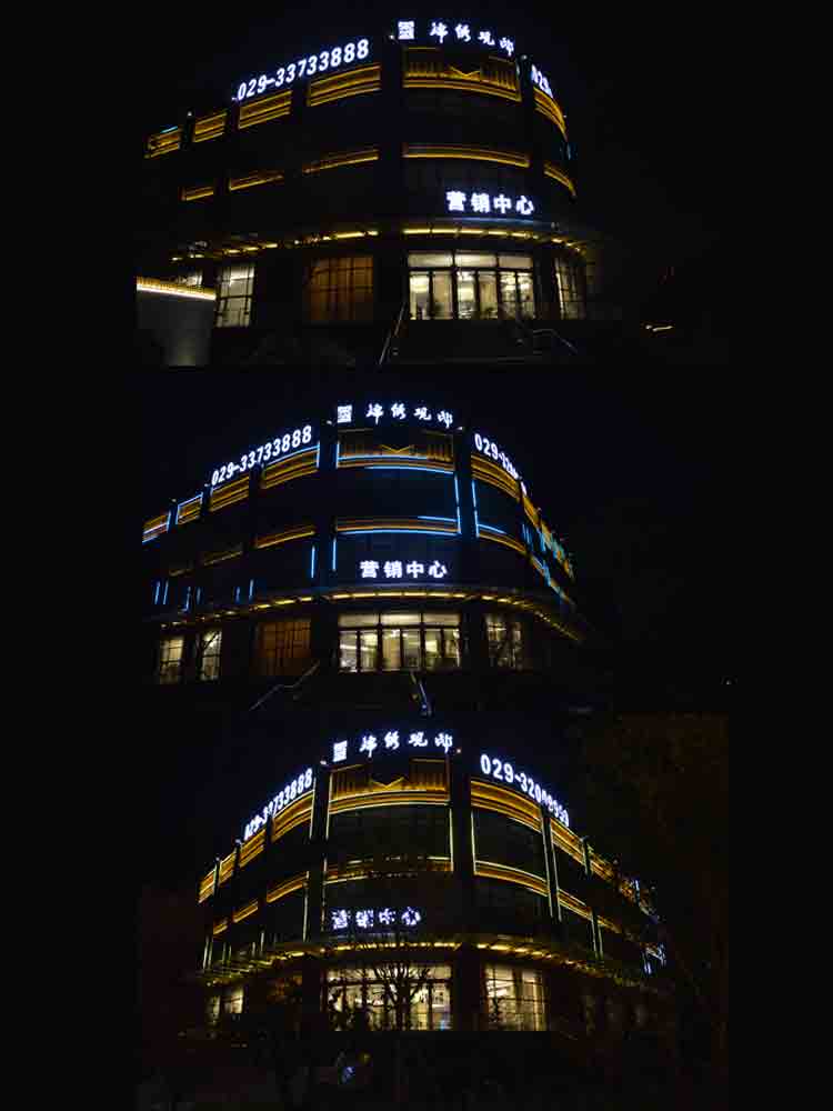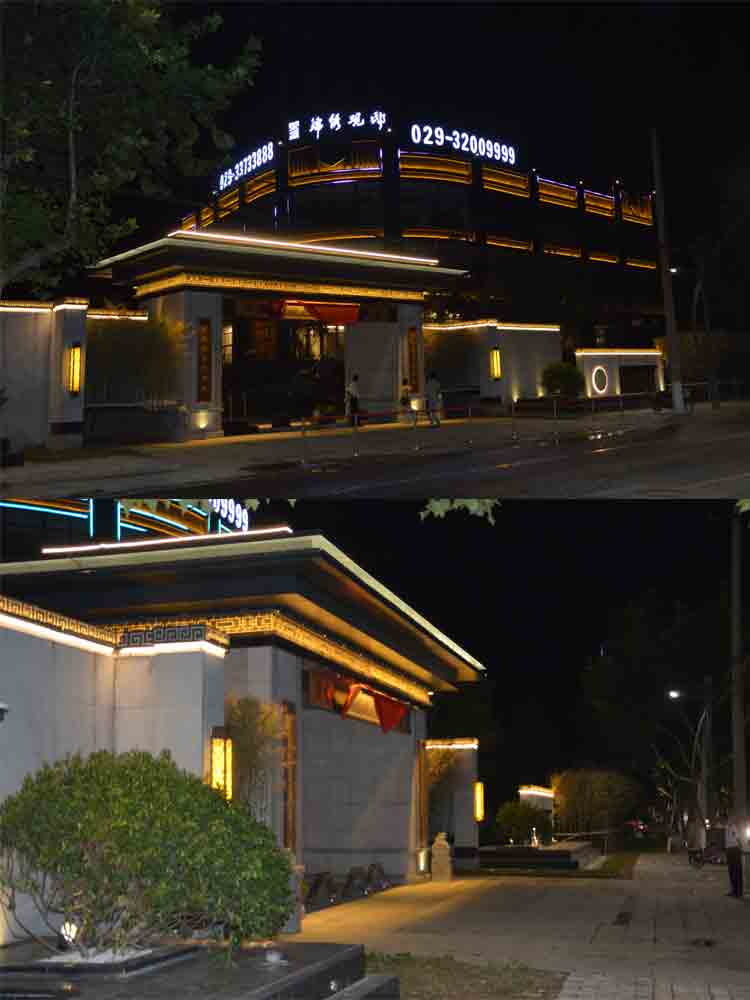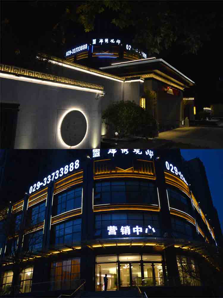 簡介—— 2018 榮盛景秀觀邸售樓部亮化,蘭光設(shè)計(jì)師根據(jù)其榮盛景秀觀邸售樓部商業(yè)屬性,商業(yè)照明設(shè)計(jì)明亮而醒目,營造商業(yè)經(jīng)營的夜景氛圍。以靜態(tài)的暖色燈光將其打亮,凸顯雅致?!皹s盛景秀觀邸”標(biāo)志以高亮度的燈光,吸引顧客注意,增強(qiáng)商業(yè)宣傳力度。景觀燈造型與建筑外立面造型完美融合,晚上光斑效果與綠植景觀交相輝映,相映成趣!榮盛景秀觀邸